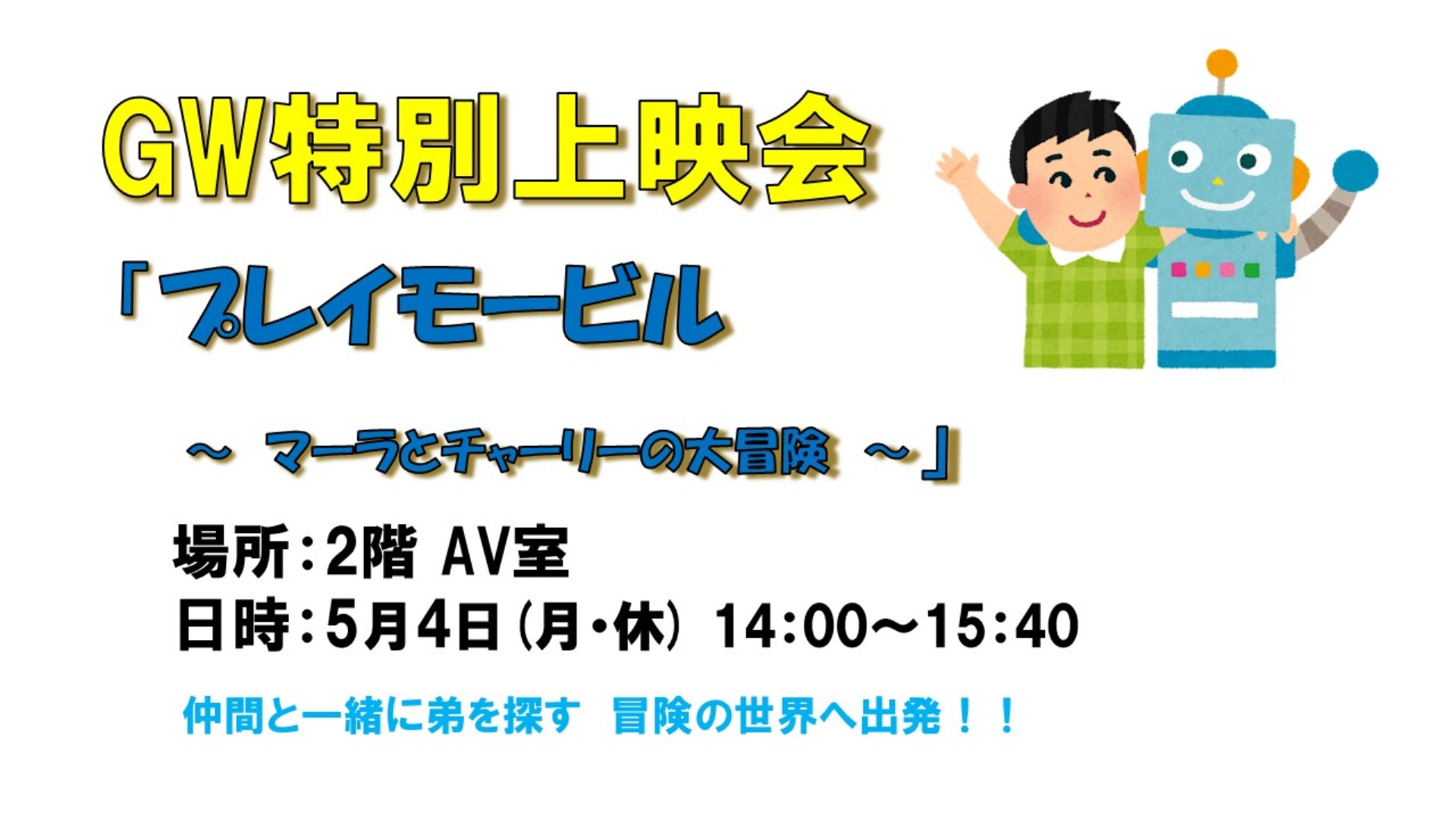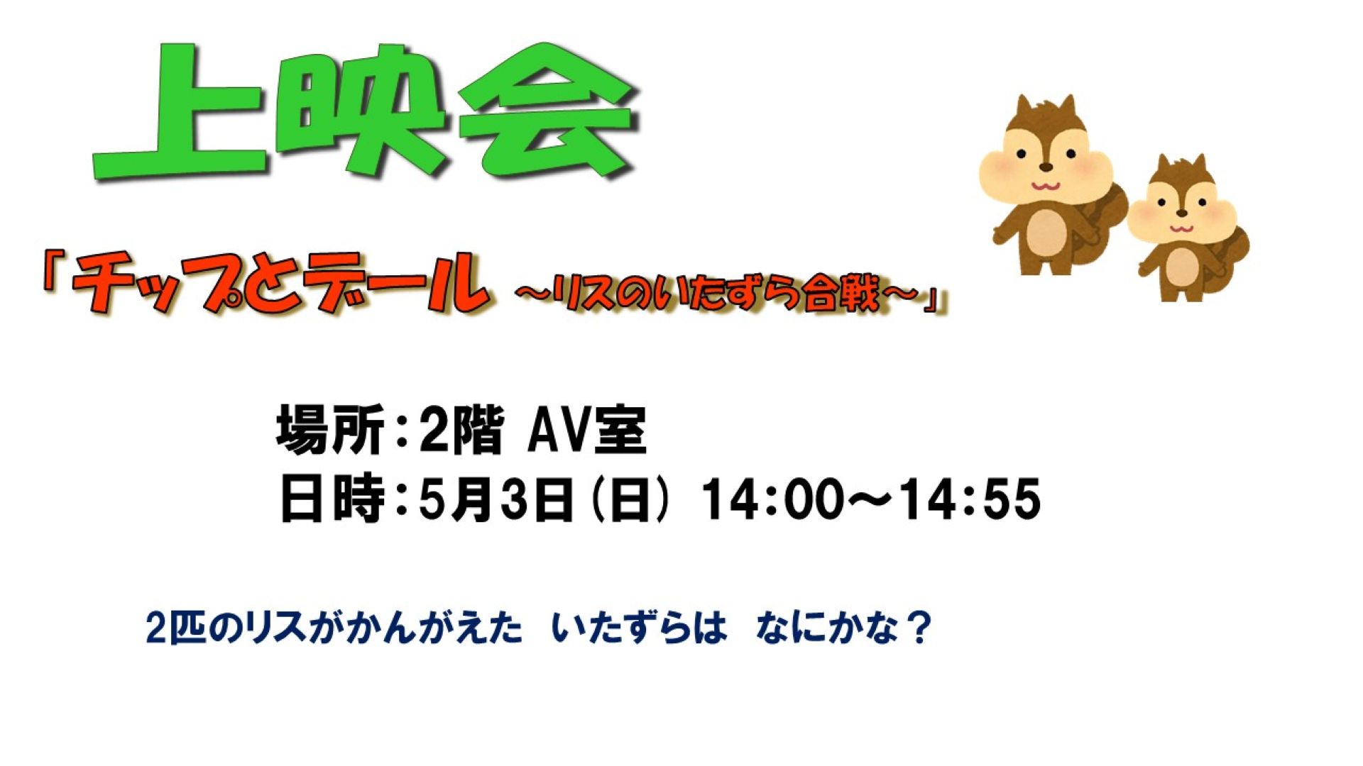 場所:2階 AV室 自由に入場できます。お気軽においでください。 次の上映予定は・・・ ※感染症の発生状況等により、人数制限または中止する場合があります。※洋画(実写)は全て字幕での上映となります。あらかじめご了承願います。 戻る